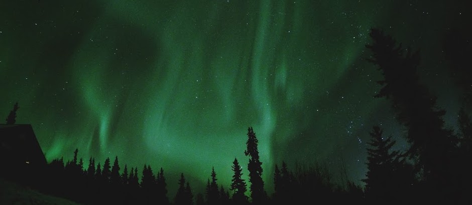 Weather has been spotty and cloudy at times, but it has always cleared up in time for our tours to catch some Aurora viewing. Fairbanks recently got a whole bunch of snow, so we have been enjoying dogsledding and plan to do some snowmobiling and cross country skiing in the near future. The spruce forests and mountains are covered in a beautiful blanket of white powder. Perfect for a snow shoe adventure through the trails in back of our cozy lodge outside of town.